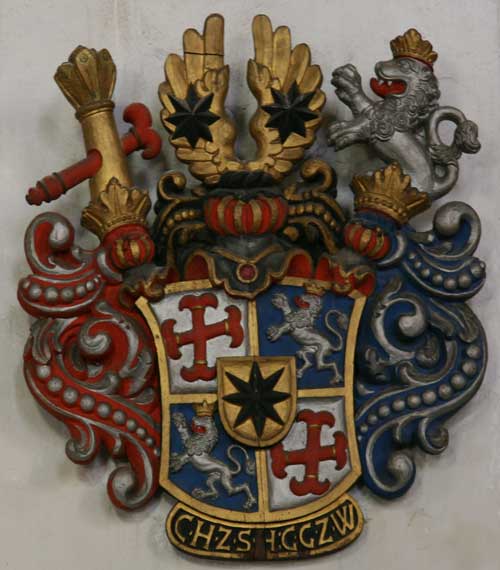 Wappentafel der Gräfin Catharina von Waldeck (1612-1649), Witwe des Grafen Simon Ludwig zur Lippe, die 1637-1643 die Regentschaft für ihren unmündigen Sohn Simon Philipp führte und die 1652 in St. Nicolai zu Lemgo bestattet wurde. 1643 heiratete sie Herzog Philipp Ludwig von Holstein, verstarb aber 6 Jahre später im Kindbett. Eine Bestattung in der Blomberger Familiengruft verwehrte man ihr.
