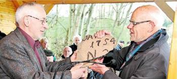 „Dieses Museum ist die Krönung der jahrzehntelangen Fürsorge für unsere Schätzchen“, erklärt Walter Sellmann (Allendorf, Eder) im Namen aller Obleute für historische Grenzsteine. Als Dank für den ehrenamtlichen Einsatz der Vöhler und als Symbol für die gemeinsame Leidenschaft überreicht er das Bruchstück eines Grenzsteins, der im 18. Jahrhundert im oberen Edertal gestanden hat (Foto).