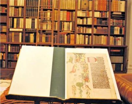 Das Buch, das einen besonderen Platz in der Bibliothek finden müsste, gibt es noch nicht: Es ist eine Biographie des Stifters aus Zürich, der sich von der Öffentlichkeit eher fern hält. Der Jurist hat sich in verschiedenen Unternehmungen betätigt, im Tourismus, im Handel mit sogenannten Schweden-Häusern und mit einer fahrenden Schreinerei. So viel wird berichtet. Seine vielfältigen Kontakte haben ihm den Zugang zu den Büchern verschafft, darunter die für Rechtswissenschaftler bedeutende Schriftensammlung „Sachsenspiegel“ aus dem 13. Jahrhundert. Was in der Bücherei vorliegt, ist eine faksimilierte Fassung des Werkes. Weitere Besonderheiten sind der Theuerdank, Erstausgaben von Ernst Jünger oder eine deutschsprachige Bibel von 1483 – also ein Werk, das schon vor Martin Luthers Übersetzungsarbeit übertragen wurde. Die Besonderheit dieses gewichtigen Buches: Die Texte sind unvollständig, weil die farbigen Lettern vermutlich aufgrund von Geldmangel nicht mehr eingedruckt worden sind.