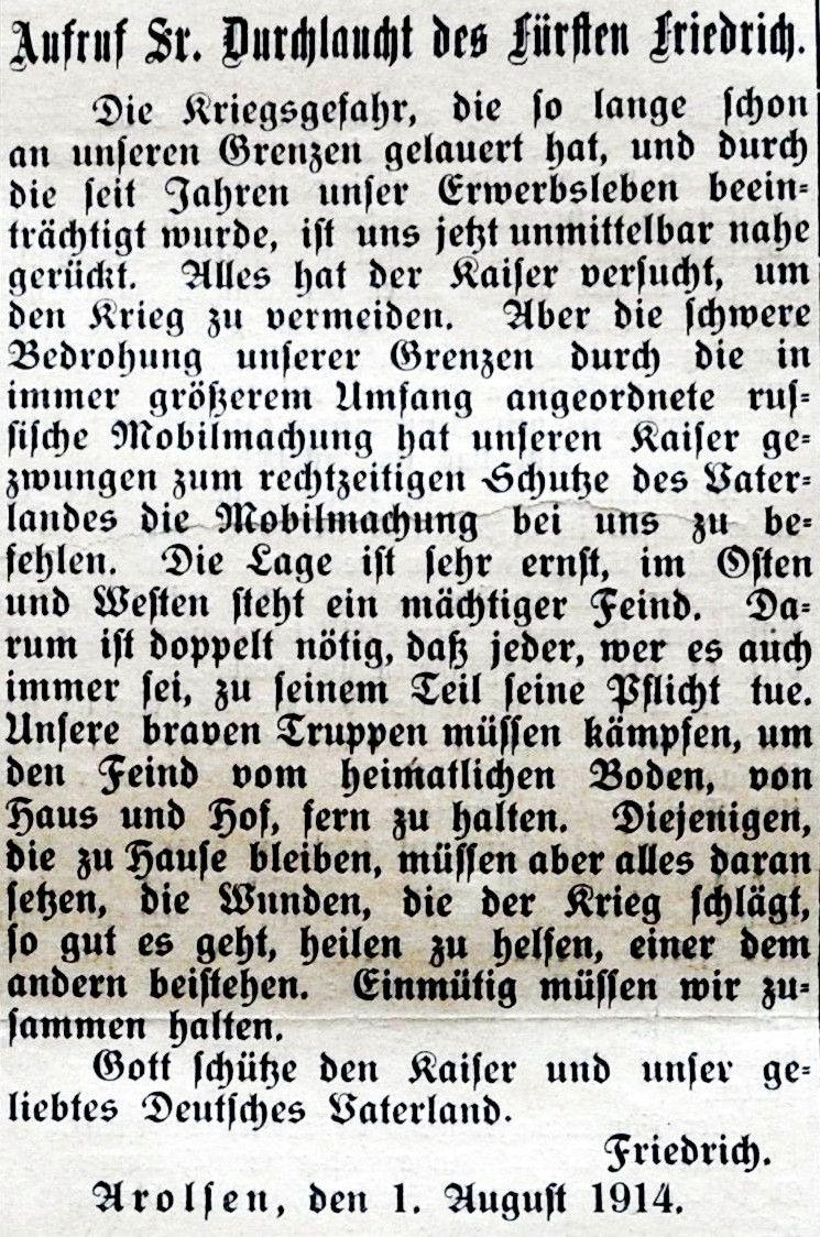 Quellen: Auswärtiges Amt (Herausgeber), Deutsche Dokumente zum Kriegsausbruch 1914, Band III, Berlin 1922. Literatur: Volker Berghahn, Der Erste Weltkrieg, München 2006. © "Mein Waldeck" WLZ Sa, 2. August 2014 mit freundlicher Genehmigung von Dr. Karl Schilling