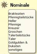 Den Zugang über Nominale werden Sie meist wählen, wenn Sie eine bestimmte Münze suchen, Ihnen aber der Wert bekannt ist - dieser steht ja oft auf der Münze. Auch hier wählen Sie aus den verschieden Gruppen Ihr gesuchtes Nominal. Dabei ist bei zweifelhaften Zuordnungen (z. B. 3 Kreuzer = 1 Groschen = 1/24tel Taler) das Nominal entscheidend, daß auf der Münze steht. Gott sei Dank kommt dieser "Kuddel-Muddel" in der waldeckischen Münzgeschichte relativ selten vor. Andere Sammelgebiete haben es da bedeutend schwerer. |