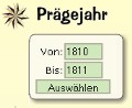 Der Zugang über Prägejahr bedarf eigentlich keiner Erläuterung. Vielleich nur soviel - hierüber besteht, durch Auswahl eines ausreichend großen Zeitraums (0000 bis 9999) auch die Möglichkeit, sich eine Gesamt-Liste anzuschauen (ACHTUNG: sehr zeitintensiv, je nach Verbindung). Alle anderen Selektionen führen zu Teilmengen der Münz-Datenbank. |