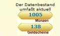 Im Anschluß an das Menü finden Sie Angaben zu den Größen der hinterlegten Münz- und Papiergelddatenbank, sowie den Tag der letzten Aktualisierung. Sie können so immer auf einen Blick erkennen, ob und was es Neues bei WaldeckerMünzen.de gibt. Ein Klick auf die Anzeige "Anzahl Münzen" oder "Anzahl Geldscheine" öffnet die Karteikarte mit der zugehörigen, unselektierten Datenbank im Hintergrund - der erste Datensatz wird mittels Zufallsgenerator ausgewählt. Sie können so in den gesamten Datenbeständen blättern. Ein Klick auf das letzte Aktualisierungsdatum zeigt Ihnen das Aktualisierungsprotokoll der Site Waldecker-Münzen. |
