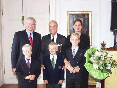 Fürst Wittekind (Mitte) mit seiner Gemahlin Fürstin Cecilie und den Söhnen Johannes, Josias und Carl-Anton (von links)anläßlich der Verleihung des Bundesverdienstkreuzes am Bande durch Ministerpräsident Roland Koch am 09.08.2001 in Bad Arolsen |